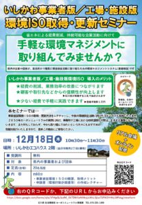 セミナー・講習会スケジュールのお知らせ>>令和7年12月18日(木)10:30~「いしかわ事業者版/工場・施設版環境ISO取得・更新セミナー」